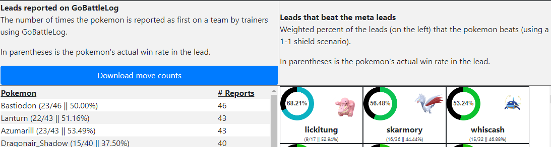 From this table you can determine that there were 46 Bastiodons reported on GoBattleLog. Out of the 46 Bastiodons reported in the lead, 23 of them were on winning teams, equating to a 50.00% win rate.